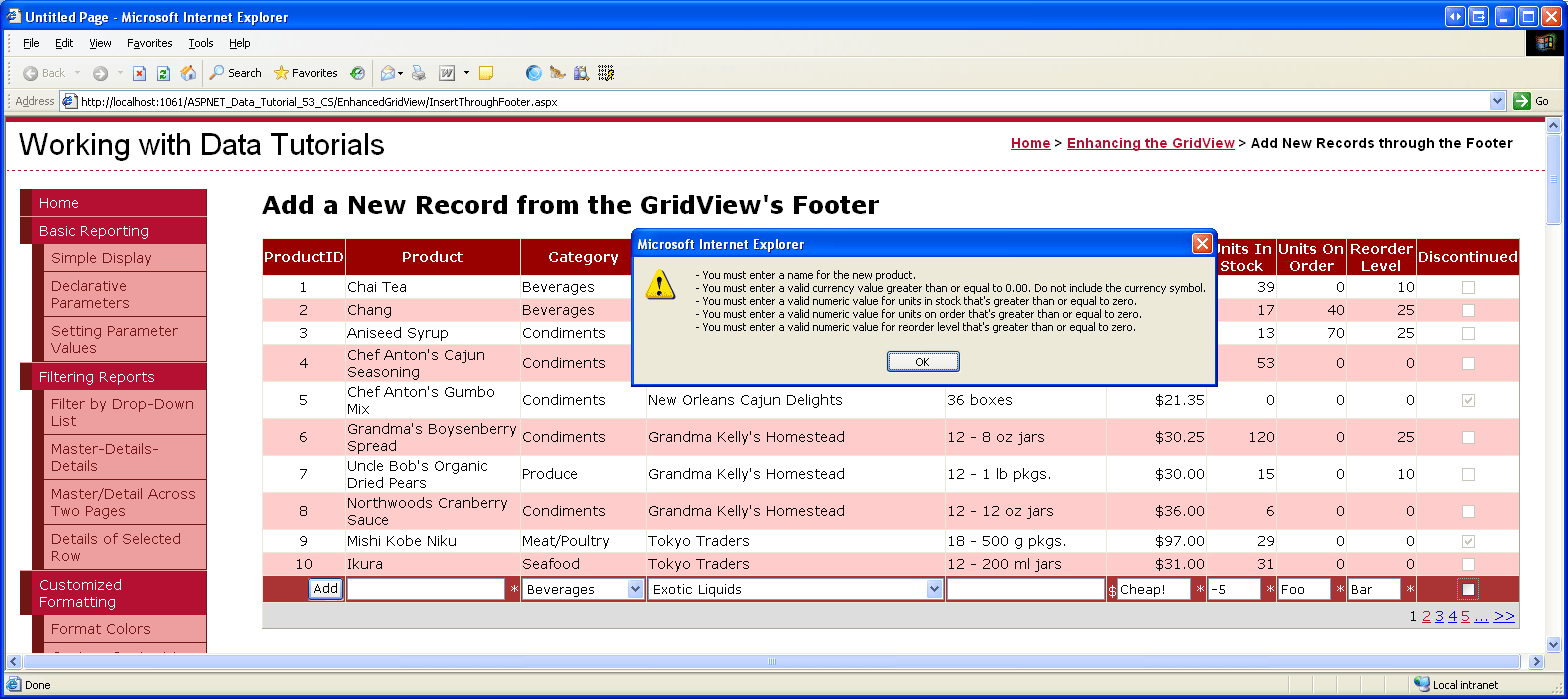 Once you ve included the Add button, test out the page in a browser. Note that when clicking the Add button with invalid data in the inserting interface, the postback is short circuited and the ValidationSummary control indicates the invalid data (see Figure 12). With appropriate data entered, clicking the Add button causes a postback. No record is added to the database, however. We will need to write a bit of code to actually perform the insert.