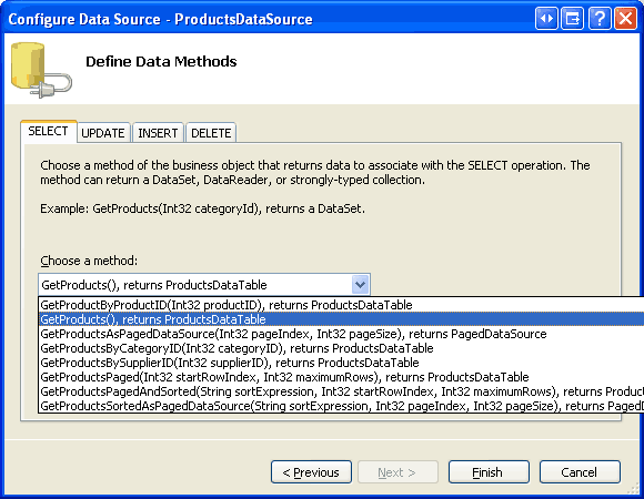 Figure 5: Figure 5: Configure the ObjectDataSource to Use the ProductsBLL Class s GetProducts Method (Click to view full-size image)