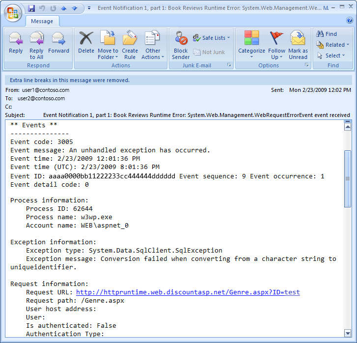 Figure 2 shows the email generated by the SimpleMailWebEventProvider class when visiting Genre.aspx?ID=foo.