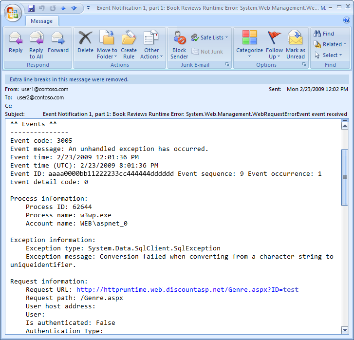 Figure 2 shows the email generated by the SimpleMailWebEventProvider class when visiting Genre.aspx?ID=foo.