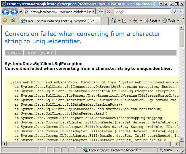 At this point we have added ELMAH to the web application, registered the ErrorLogModule HTTP Module and the ErrorLogPageFactory HTTP Handler, specified ELMAH's configuration options in Web.config, and added the needed database objects for the SqlErrorLog error log provider. We are now ready to see ELMAH in action! Visit the Book Reviews website and visit a page that generates a runtime error, such as Genre.aspx?ID=foo, or a non-existent page, such as NoSuchPage.aspx. What you see when visiting these pages depends on the <customErrors> configuration and whether you're visiting locally or remotely. (Refer back to the Displaying a Custom Error Page tutorial for a refresher on this topic.)
