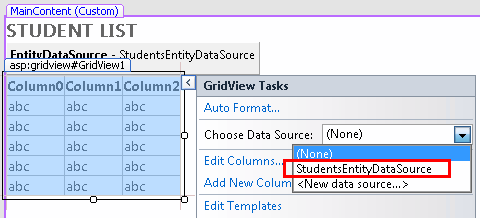Open or switch to Students.aspx and switch to Design view. From the Data tab of the Toolbox, drag a GridView control to the right of the EntityDataSource control, name it StudentsGridView, click the smart tag, and then select StudentsEntityDataSource as the data source.