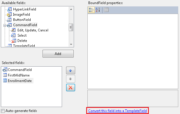 Select the FirstMidName field and then click Convert this field into a TemplateField.