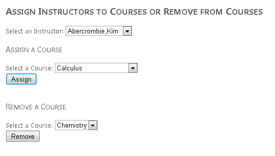 DropDownListcontrol for selecting a course to assign. This control will be populated with courses that are currently not assigned to the selected instructor. - A