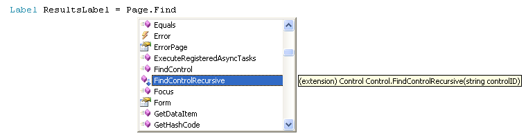 With this code in place, return to the IDIssues.aspx page's code-behind class and comment out the current FindControl method calls. Replace them with calls to Page.FindControlRecursive("controlID"). What's neat about extension methods is that they appear directly within the IntelliSense drop-down lists. As Figure 7 shows, when you type Page and then hit period, the FindControlRecursive method is included in the IntelliSense drop-down along with the other Control class methods.