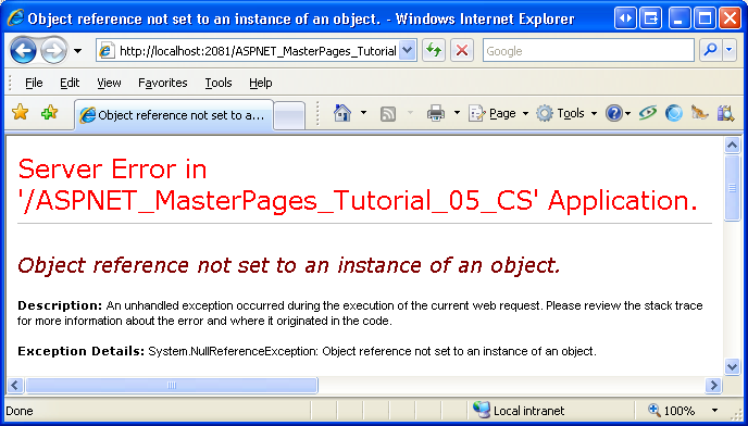 If you visit the page through a browser, enter your age, and click the "Submit" button, a NullReferenceException is raised. If you set a breakpoint in the SubmitButton_Click event handler you will see that this exception occurs when attempting to call the MainContent object's FindControl method. The MainContent object is null because the FindControl method cannot locate an object named "MainContent". The underlying reason is the same as with the Results Label and Age TextBox controls: FindControl starts its search from the top of the control hierarchy and does not penetrate naming containers, but the MainContent ContentPlaceHolder is within the master page, which is a naming container.