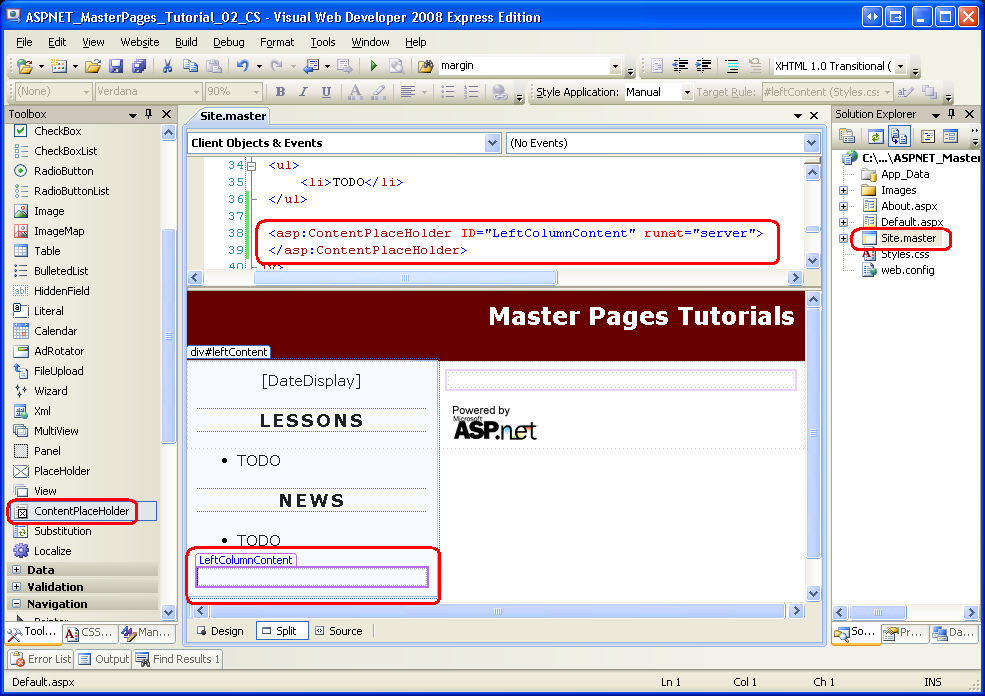 Figure 02: Add a ContentPlaceHolder Control to the Master Page's Left Column (Click to view full-size image)