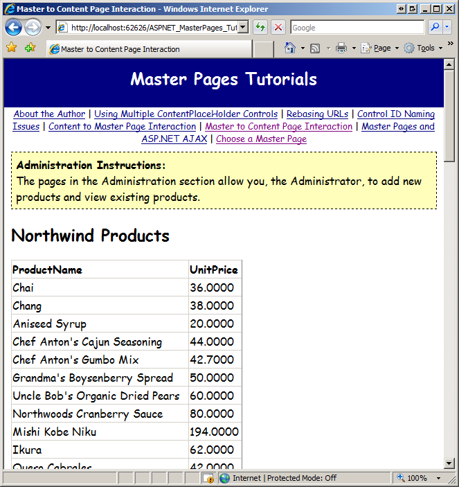 With this code in place, you should be able to visit and use the content pages in the Administration section. Figure 12 shows the ~/Admin/Products.aspx page when viewed through a browser. As you can see, the page includes the Administration Instructions box, which is defined in the nested master page.