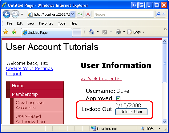 Return to the ManageUsers.aspx page and click the Manage link for the locked out user. As Figure 5 shows, you should see a value in the LastLockedOutDateLabel the Unlock User button should be enabled. Click the Unlock User button to unlock the user account. Once you have unlocked the user, they will be able to login again.