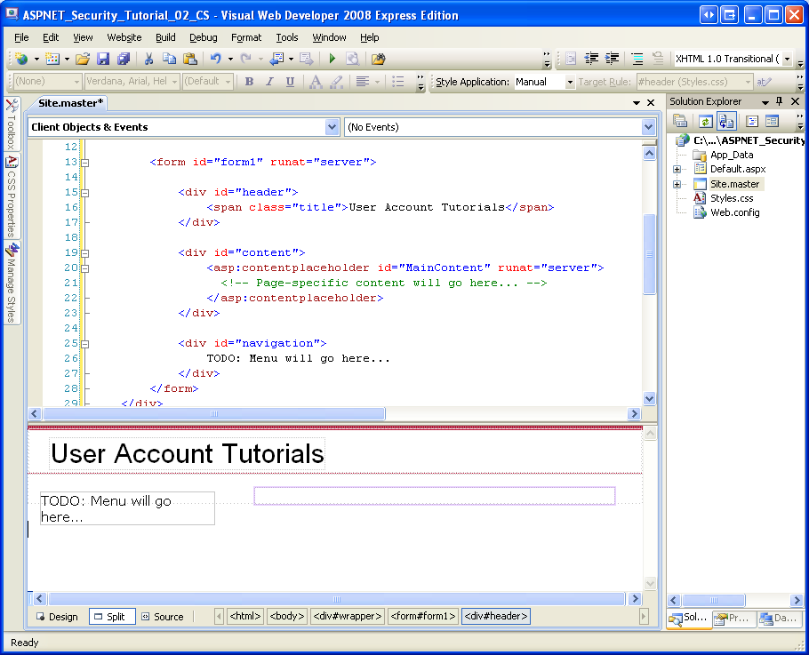 Our master page includes a section for a menu or some other navigation interface. We will create such an interface in a future tutorial.