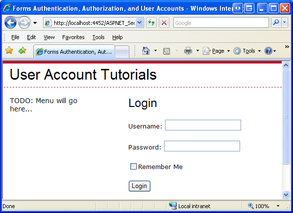 In this tutorial we will turn from mere discussion to implementation; in particular, we will look at implementing forms authentication. The web application we start constructing in this tutorial will continue to be built upon in subsequent tutorials, as we move from simple forms authentication to membership and roles.
