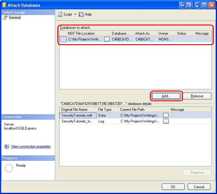 Figure 4: Attach the SecurityTutorials.mdf Database (Click to view full-size image)