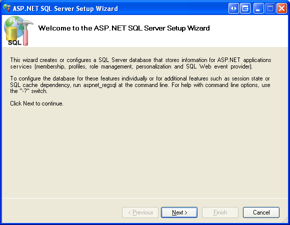 The aspnet_regsql.exe tool offers both command line functionality and a graphical user interface. The graphical interface is more user friendly and is what we will examine in this tutorial. The command line interface is useful when the addition of the SqlMembershipProvider schema needs to be automated, such as in build scripts or automated testing scenarios.