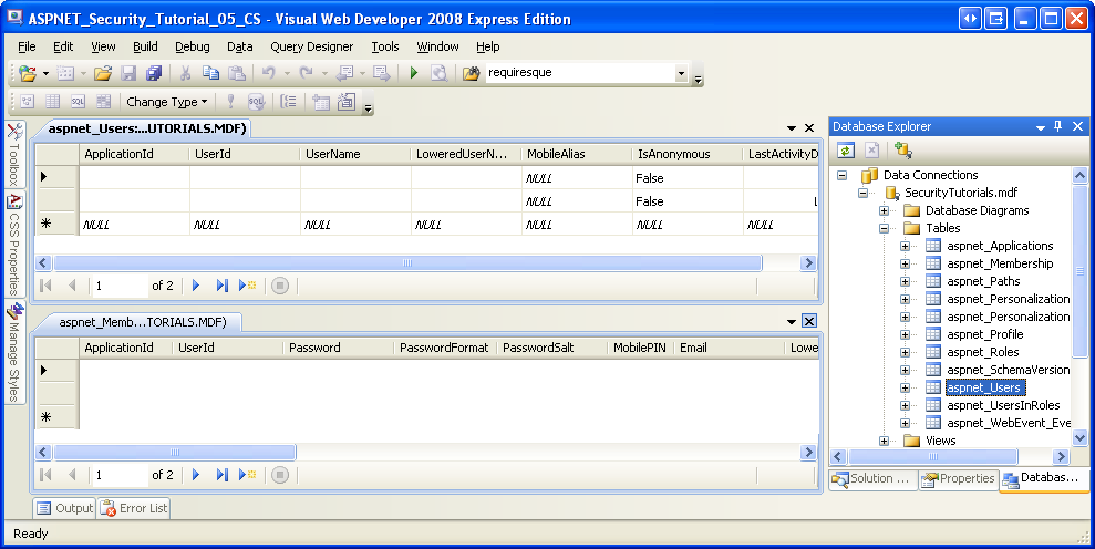 After creating a new user account, return to Visual Studio and examine the aspnet_Users and aspnet_Membership tables like we did in Figure 10 to verify that the account was successfully created.