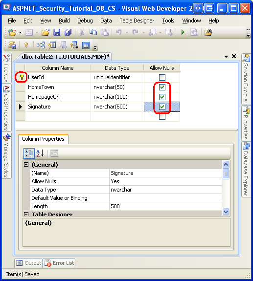 We will create a new table called UserProfiles to save the home town, homepage, and signature for each user. Right-click on the Tables folder in the Database Explorer window and choose to create a new table. Name the first column UserId and set its type to uniqueidentifier. Disallow NULL values and mark the column as a primary key. Next, add columns named: HomeTown of type nvarchar(50); HomepageUrl of type nvarchar(100); and Signature of type nvarchar(500). Each of these three columns can accept a NULL value.