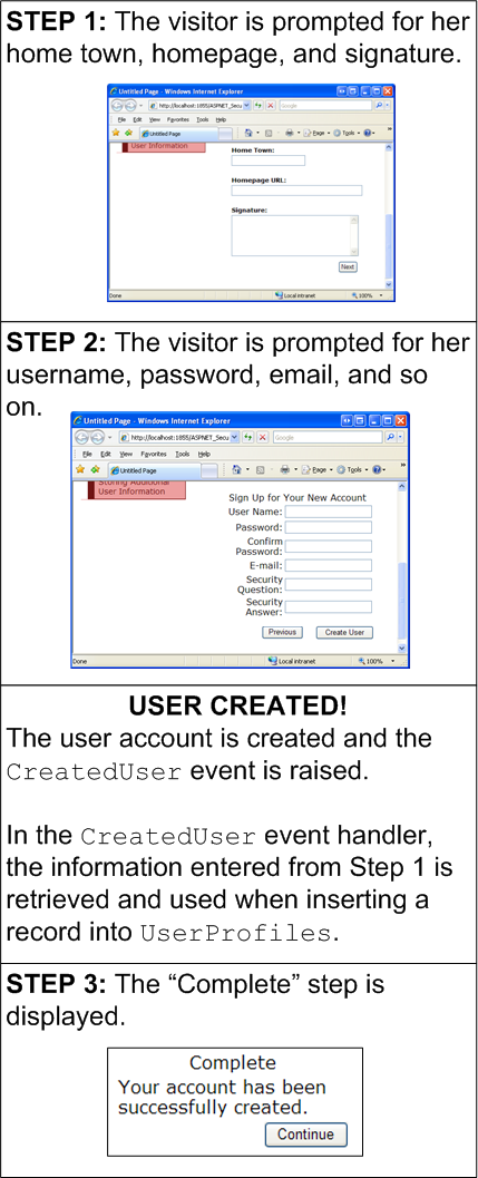 The CreateUserWizard control's default interface is sufficient for simple account creation scenarios where only core user account information like username, password, and email need be collected. But what if we wanted to prompt the visitor to enter her home town, homepage, and signature while creating her account? It is possible to customize the CreateUserWizard control's interface to collect additional information at signup, and this information may be used in the CreatedUser event handler to insert additional records into the underlying database.
