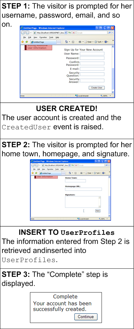 The workflow shown in Figure 22 waits to insert a record into the UserProfiles table until after Step 2 completes. If the visitor closes her browser after step 1, however, we will have reached a state where a user account was created, but no record was added to UserProfiles. One workaround is to have a record with NULL or default values inserted into UserProfiles in the CreatedUser event handler (which fires after step 1), and then update this record after step 2 completes. This ensures that a UserProfiles record will be added for the user account even if the user quits the registration process midway through.