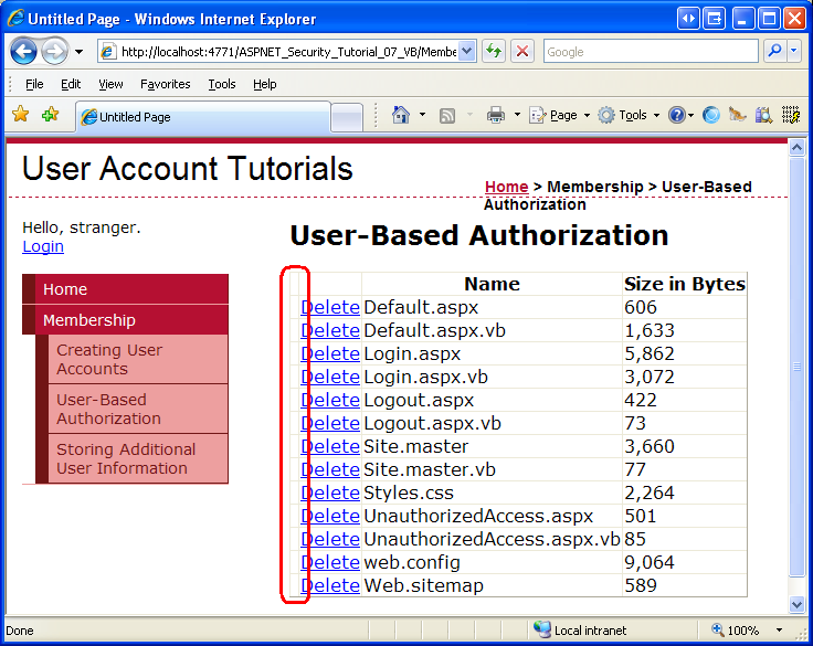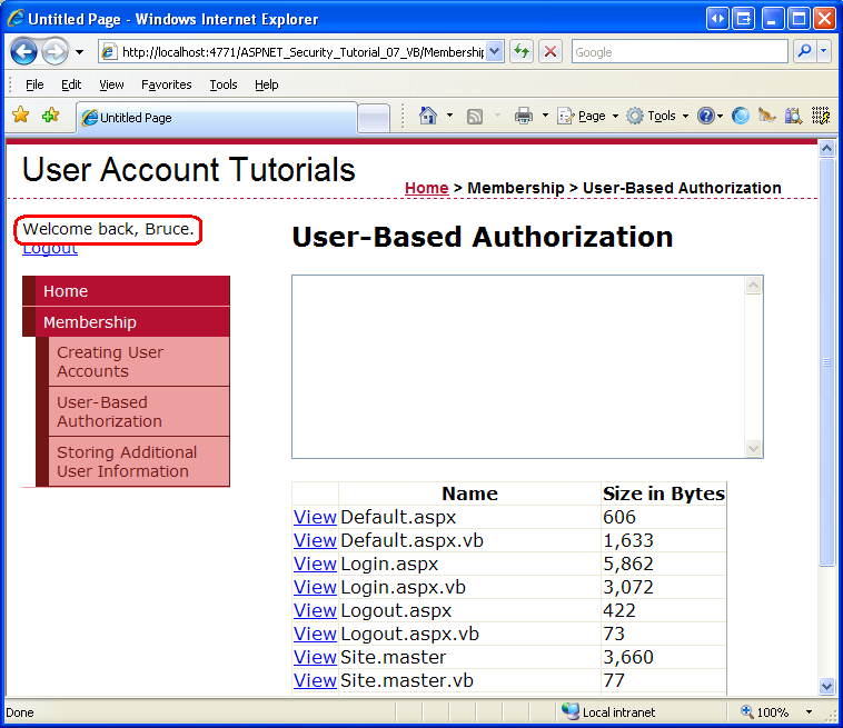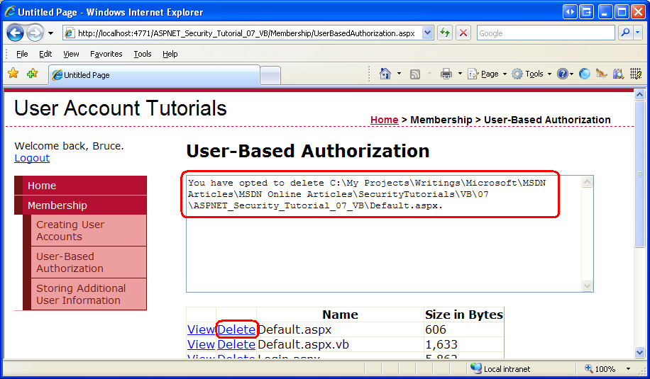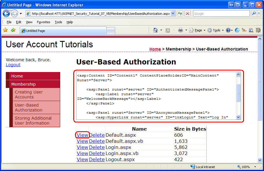 Currently, any authenticated or anonymous user can visit the UserBasedAuthorization.aspx page and view or delete files. Let's make it so that only authenticated users can view contents of a file and only Tito can delete a file. Such fine grain authorization rules can be applied declaratively, programmatically, or through a combination of both methods. Let's use the declarative approach to limit who can view the contents of a file; we'll use the programmatic approach to limit who can delete a file.