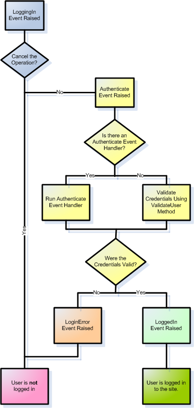 If the log in operation is not cancelled, the workflow progresses by raising the Authenticate event. If there is an event handler for the Authenticate event, then it is responsible for determining whether the supplied credentials are valid or not. If no event handler is specified, the Login control uses the Membership.ValidateUser method to determine the validity of the credentials.