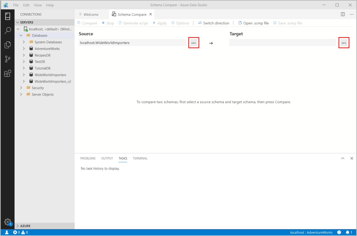 Select one of the ellipses (...) to change the Source and Target of your Schema Compare and select OK.