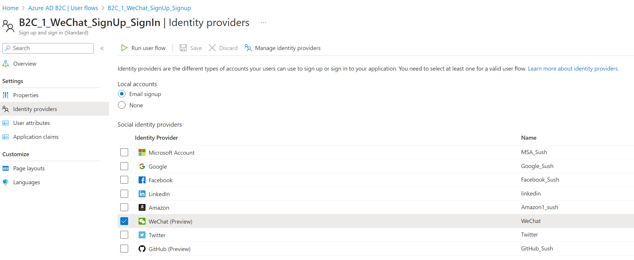 <ClaimsProvider> <Domain>wechat.com</Domain> <DisplayName>WeChat (Preview)</DisplayName> <TechnicalProfiles> <TechnicalProfile Id="WeChat-OAuth2"> <DisplayName>WeChat</DisplayName> <Protocol Name="OAuth2" /> <Metadata> <Item Key="ProviderName">wechat</Item> <Item Key="authorization_endpoint">https://open.weixin.qq.com/connect/qrconnect</Item> <Item Key="AccessTokenEndpoint">https://api.weixin.qq.com/sns/oauth2/access_token</Item> <Item Key="ClaimsEndpoint">https://api.weixin.qq.com/sns/userinfo</Item> <Item Key="scope">snsapi_login</Item> <Item Key="HttpBinding">GET</Item> <Item Key="AccessTokenResponseFormat">json</Item> <Item Key="ClientIdParamName">appid</Item> <Item Key="ClientSecretParamName">secret</Item> <Item Key="ExtraParamsInAccessTokenEndpointResponse">openid</Item> <Item Key="ExtraParamsInClaimsEndpointRequest">openid</Item> <Item Key="ResponseErrorCodeParamName">errcode</Item> <Item Key="external_user_identity_claim_id">unionid</Item> <Item Key="client_id">Your WeChat application ID</Item> </Metadata> <CryptographicKeys> <Key Id="client_secret" StorageReferenceId="B2C_1A_WeChatSecret" /> </CryptographicKeys> <OutputClaims> <OutputClaim ClaimTypeReferenceId="UserId" PartnerClaimType="unionid" /> <OutputClaim ClaimTypeReferenceId="identityProvider" DefaultValue="wechat.com" AlwaysUseDefaultValue="true" /> <OutputClaim ClaimTypeReferenceId="authenticationSource" DefaultValue="socialIdpAuthentication" AlwaysUseDefaultValue="true" /> </OutputClaims> <OutputClaimsTransformations> <OutputClaimsTransformation ReferenceId="CreateRandomUPNUserName" /> <OutputClaimsTransformation ReferenceId="CreateUserPrincipalName" /> <OutputClaimsTransformation ReferenceId="CreateAlternativeSecurityId" /> <OutputClaimsTransformation ReferenceId="CreateSubjectClaimFromAlternativeSecurityId" /> </OutputClaimsTransformations> <UseTechnicalProfileForSessionManagement ReferenceId="SM-SocialLogin" /> </TechnicalProfile> </TechnicalProfiles> </ClaimsProvider>Set client_id to the application ID from the application registration.