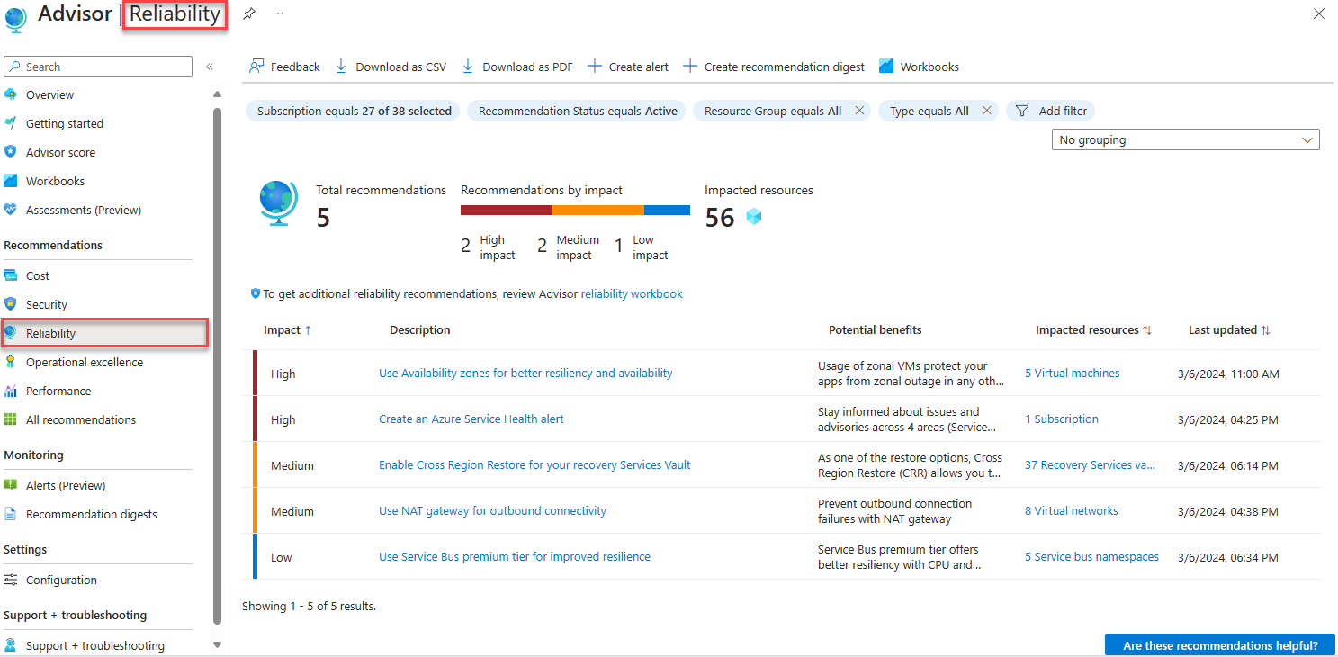 You can apply filters to display recommendations for specific subscriptions and resource types.