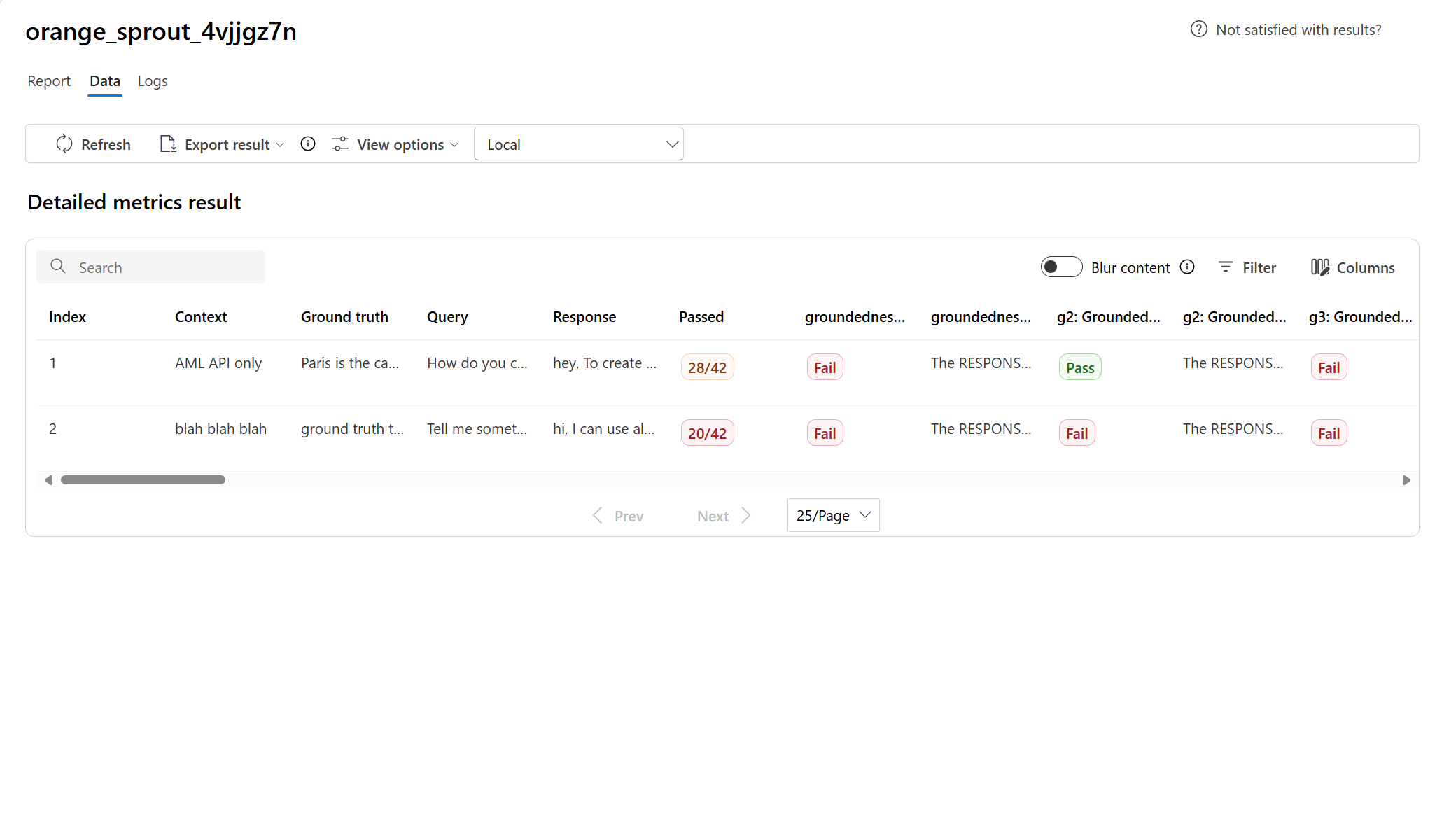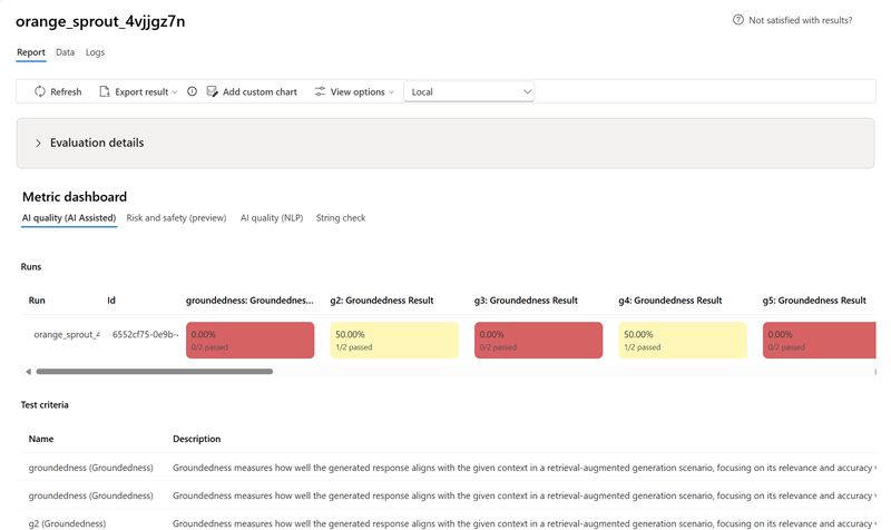 | Groundedness unexpectedly low | Retrieval/context incomplete | Verify context construction / retrieval latency |