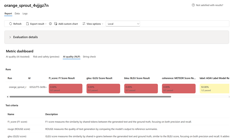 In the Metric dashboard section, aggregate views are broken down by metrics that include AI quality (AI Assisted), Risk and safety (preview), AI Quality (NLP), and Custom (when applicable). Results are measured as percentages of pass/fail based on the criteria selected when the evaluation was created. For more in-depth information on metric definitions and how they're calculated, see What are evaluators?.