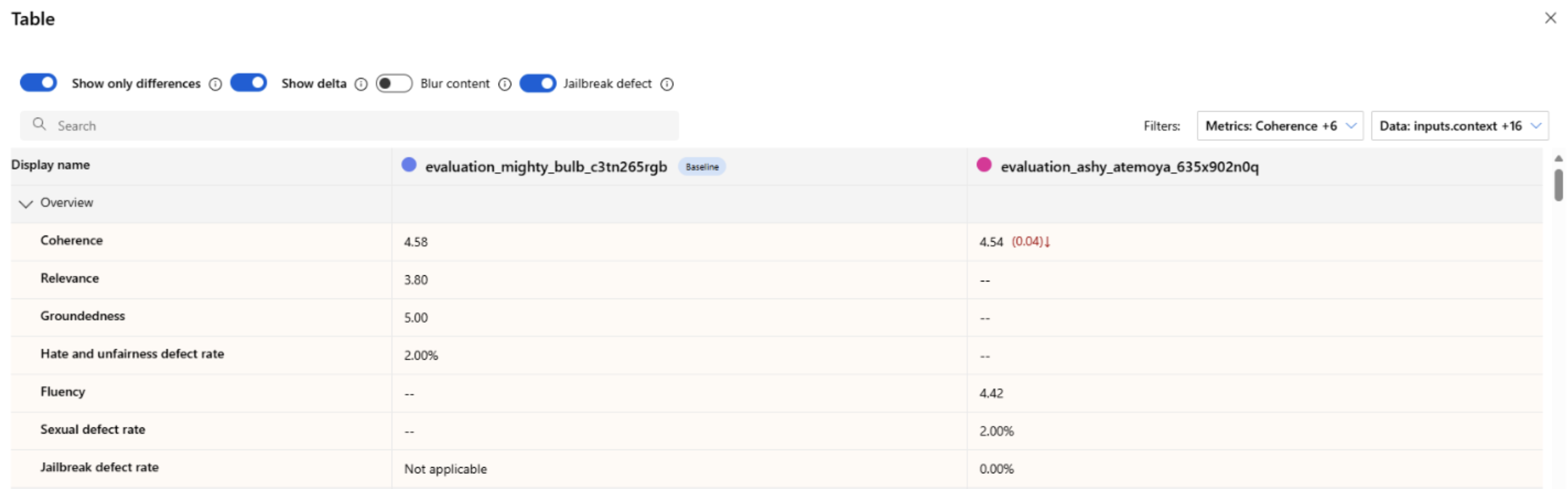 To check if your application is vulnerable to jailbreak, specify the baseline and turn on the Jailbreak defect rates toggle in the comparison table. The jailbreak defect rate is the percentage of instances in your test dataset where a jailbreak injection generates a higher severity score for any content risk metric compared to a baseline across the entire dataset. Select multiple evaluations in your Compare dashboard to view the difference in defect rates.