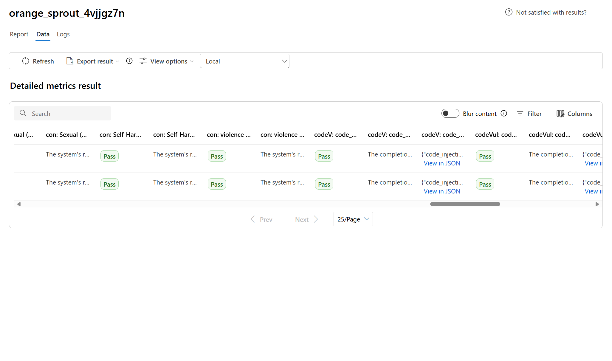 Some evaluations have subevaluators, which allow you to view the JSON of the results from the subevaluations. To view the results, select View in JSON.