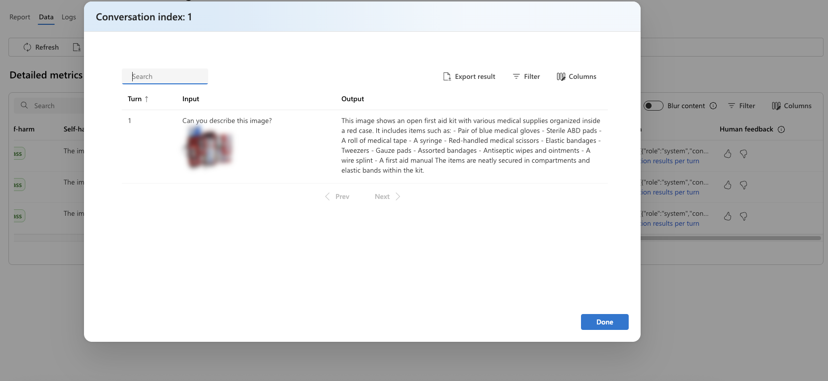 For a safety evaluation in a multi-modal scenario (text and images), you can better understand the evaluation result by reviewing the images from both the input and output in the detailed metrics result table. Because multi-modal evaluation is currently supported only for conversation scenarios, you can select View evaluation results per turn to examine the input and output for each turn.