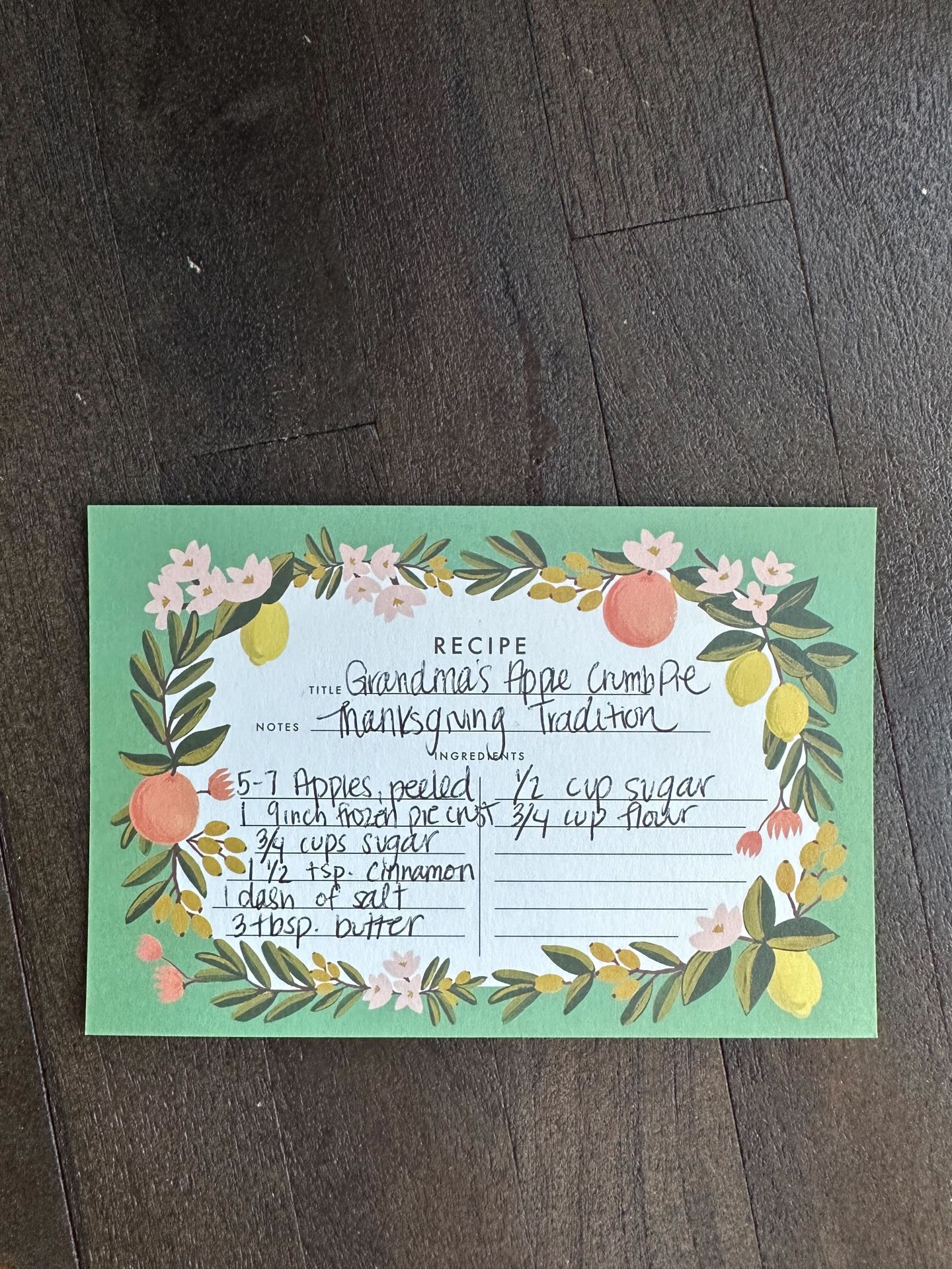 The image contains a recipe card titled Grandma's Apple Crumb Pie. It is noted as a Thanksgiving tradition. The ingredients listed are: