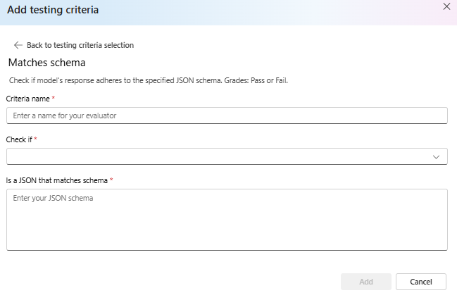 When you click into each testing criteria, you will see different types of graders as well as preset schemas that you can modify per your own evaluation dataset and criteria.