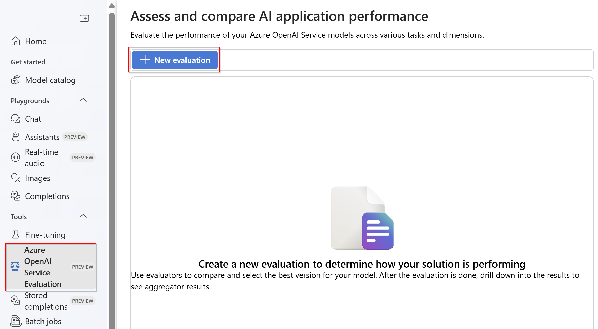 1. Select the Azure OpenAI Evaluation (PREVIEW) within Microsoft Foundry portal. To see this view as an option, first select an existing Azure OpenAI resource in a supported region.
