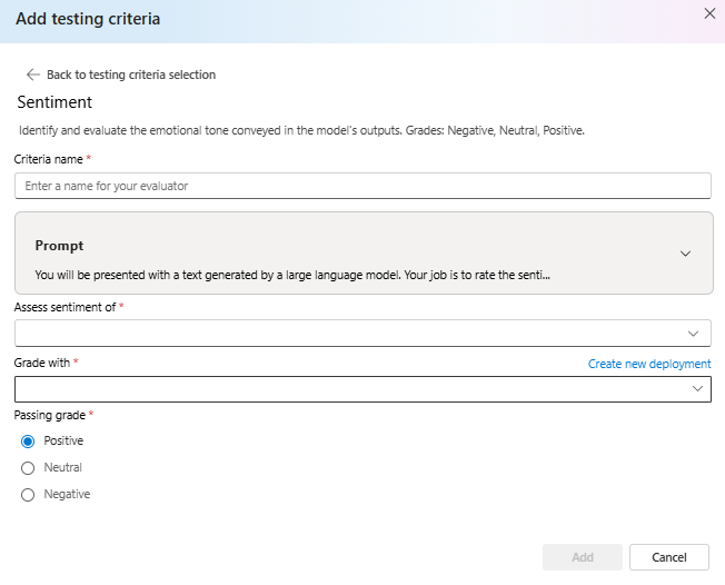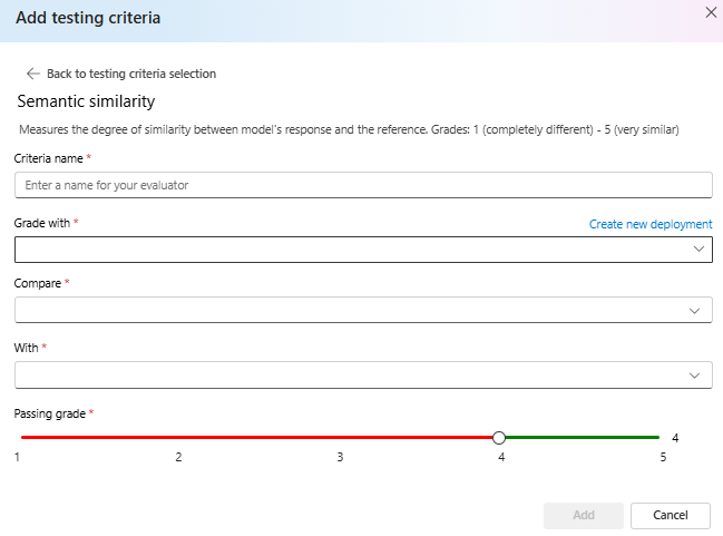 1. For creating a test criteria, select Add. For the example file we provided, we are going to be assessing semantic similarity. Select Model Scorer, which contains test criteria presets for Semantic Similarity.