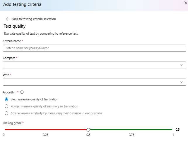 Screenshot that shows the evaluations testing criteria options.