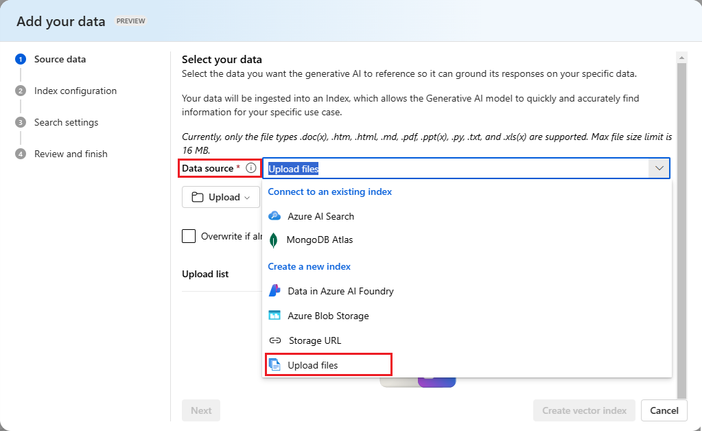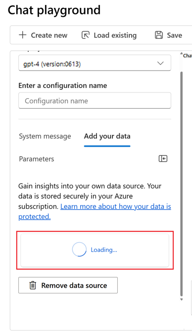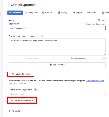 5. On the left side of the chat playground, select Add your data > + Add a new data source.