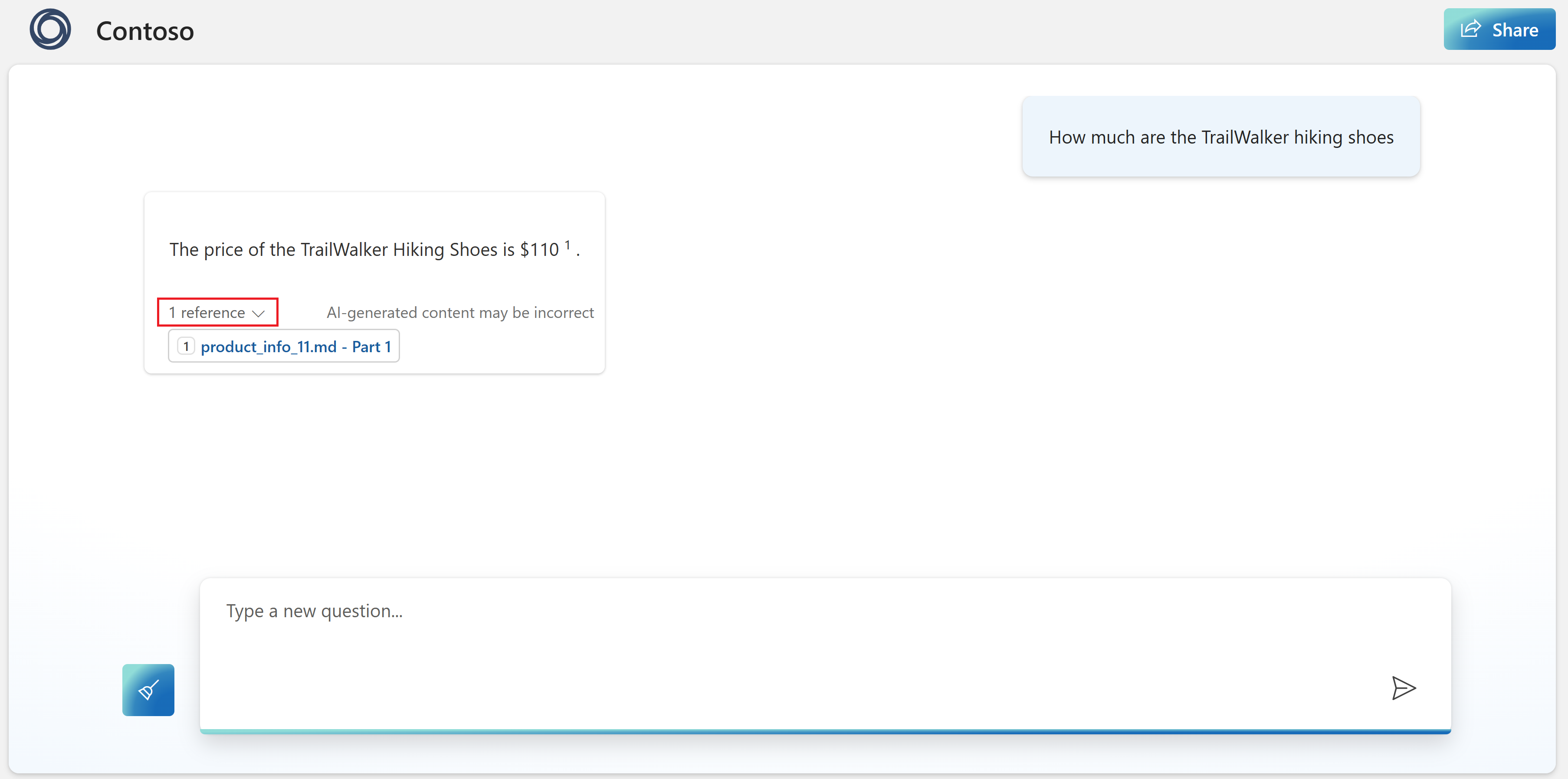 5. In your web app, ask the same question as before ("How much are the TrailWalker hiking shoes"). This time, the app uses information from your data to construct the response. Expand the reference button to see the data used.