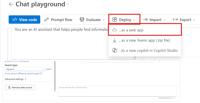 1. Complete the steps in the previous section to add your data to the playground. You can deploy a web app with or without your own data, but you need a deployed model as described in the Foundry playground quickstart.
