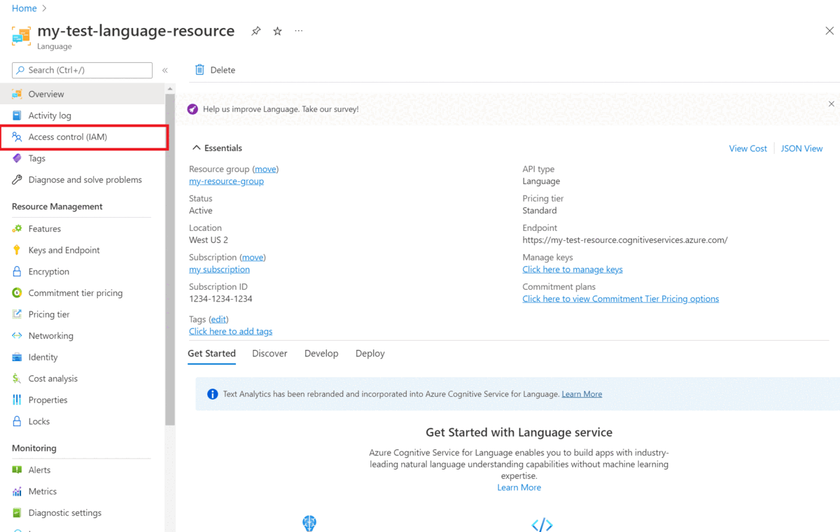 Go to your storage account or Language resource in the Azure portal.
