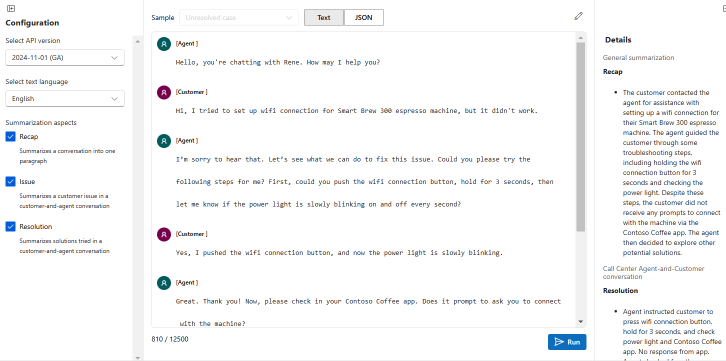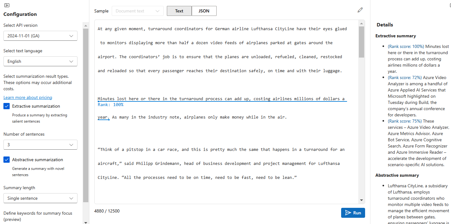Summarization condenses information for text and conversations (chat and transcripts). Text summarization generates a summary, supporting two approaches: Extractive summarization creates a summary by selecting key sentences from the document and preserving their original positions. In contrast, abstractive summarization generates a summary by producing new, concise, and coherent sentences or phrases that aren't directly copied from the original document. Conversation summarization recaps and segments long meetings into timestamped chapters. Call center summarization summarizes customer issues and resolution.