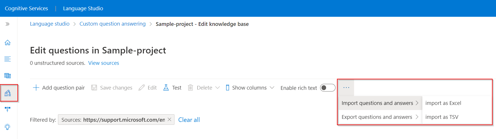 From the edit project pane for your project, select the ... (ellipsis) icon from the menu > Import questions and answers > Import as TSV. Then, select Choose file to browse to the copy of SampleActiveLearning.tsv that you downloaded to your computer in the previous step, and then select done.