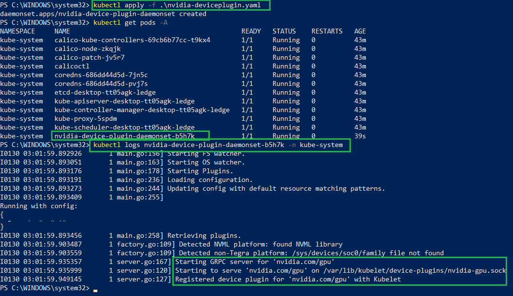 kubectl apply –f nvidia-deviceplugin.yamlVerify that the plugin is running and the NVIDIA GPU is detected by checking the logs of the deviceplugin pod using the