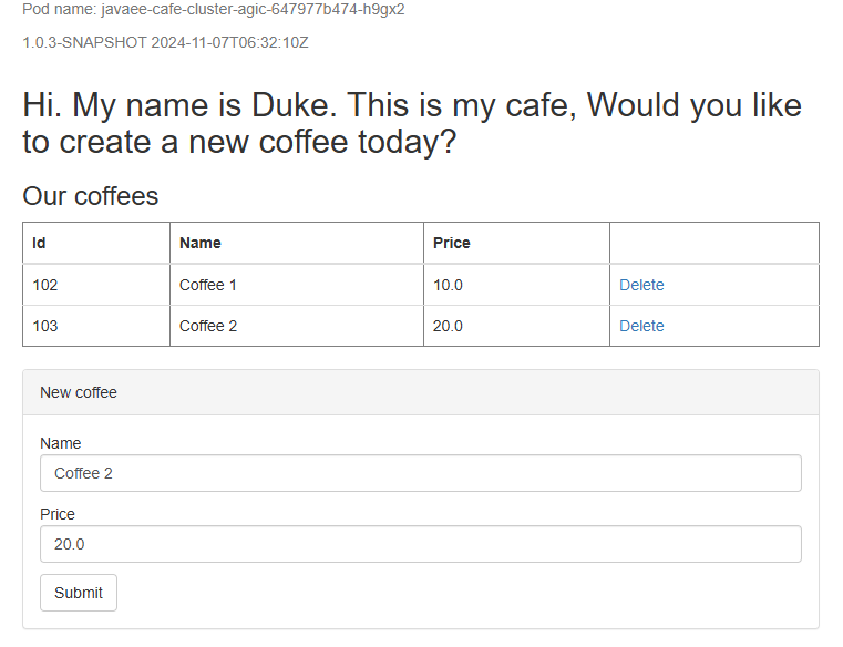 NAME READY STATUS RESTARTS AGE javaee-cafe-cluster-agic-67cdc95bc-2j2gr 1/1 Running 0 29s javaee-cafe-cluster-agic-67cdc95bc-fgtt8 1/1 Running 0 29s javaee-cafe-cluster-agic-67cdc95bc-h47qm 1/1 Running 0 29s