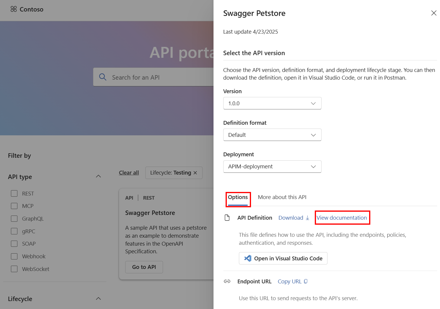 4. Under Options, select View documentation. Screenshot of API details in API Center portal.