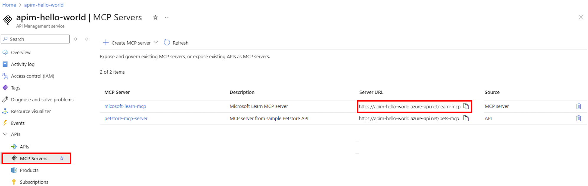 API Management also supports MCP servers natively exposed in API Management from managed REST APIs. For more information, see Expose a REST API as an MCP server.