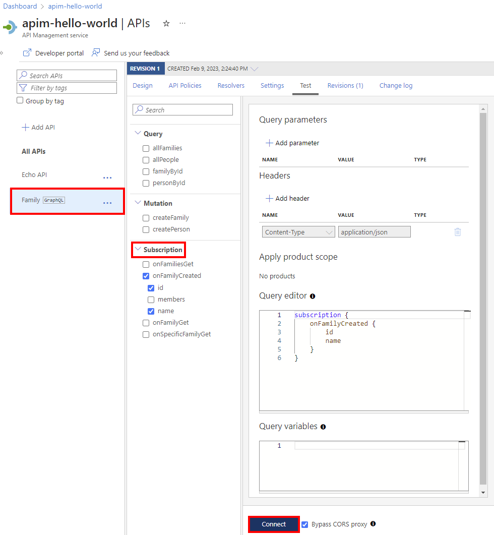 Set up a subscription query in the query editor, and then select Connect to establish a WebSocket connection to the backend service.