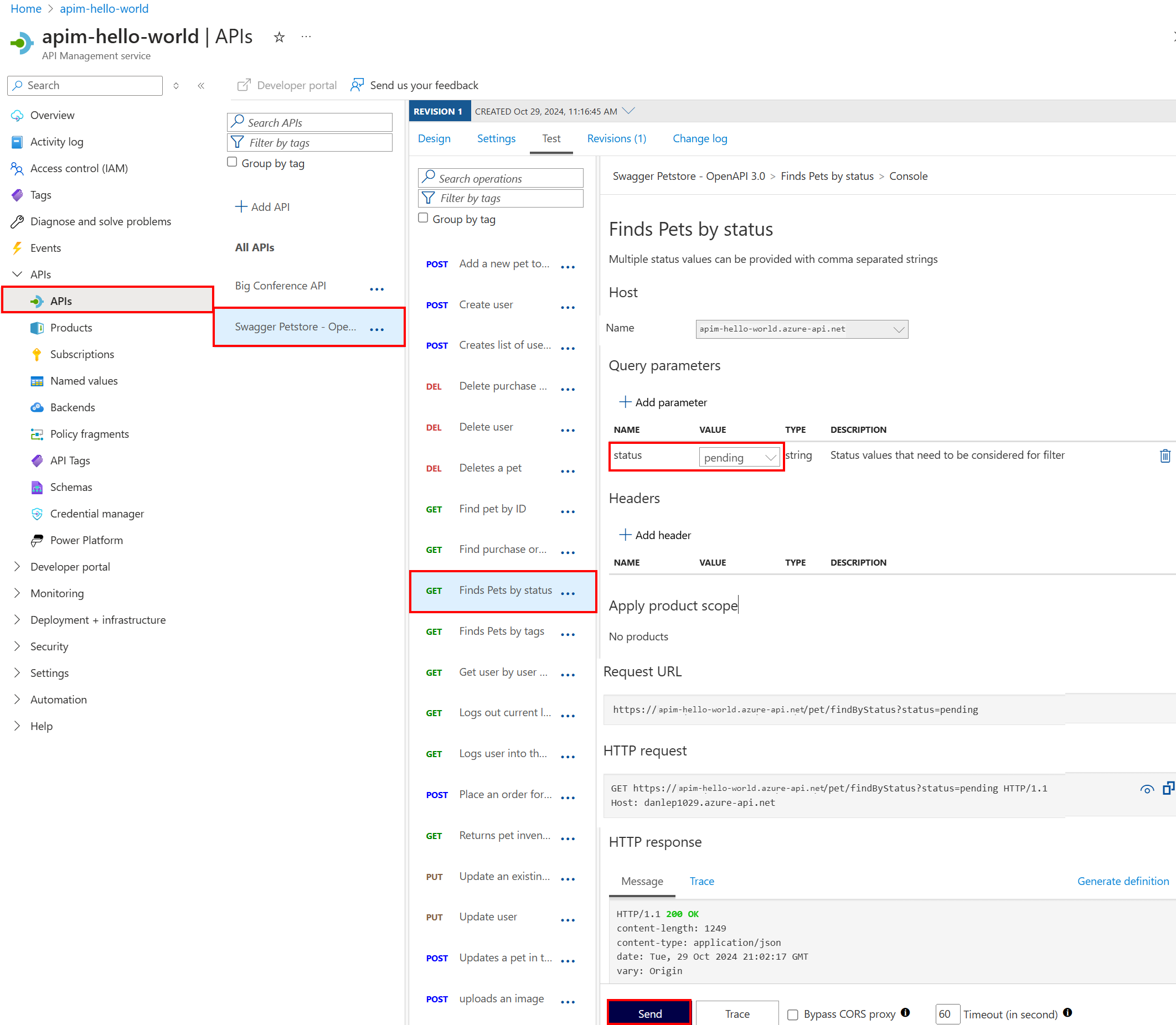 Select the Test tab, and then select Finds Pets by status. The page shows the status Query parameter. Select one of the available values, such as pending. You can also add query parameters and headers here.