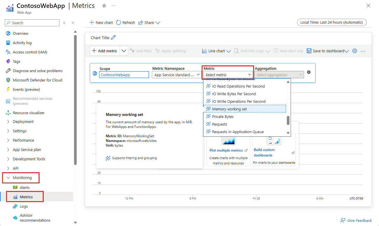 You can monitor your app to find out if it's having any problems. On the Azure portal page for your app, select Monitoring > Metrics. The Metric dropdown menu shows you the metrics that you can add.