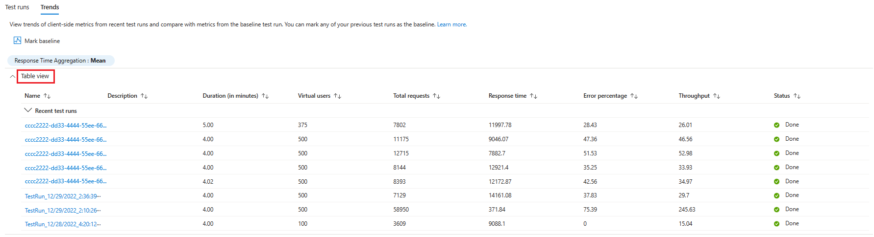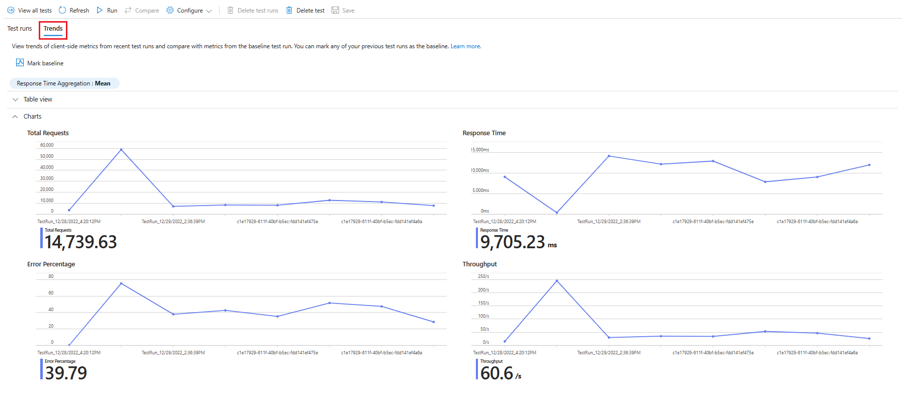 You can mark a test run as a baseline to compare the client-side metrics of the recent test runs with the metrics of the baseline.